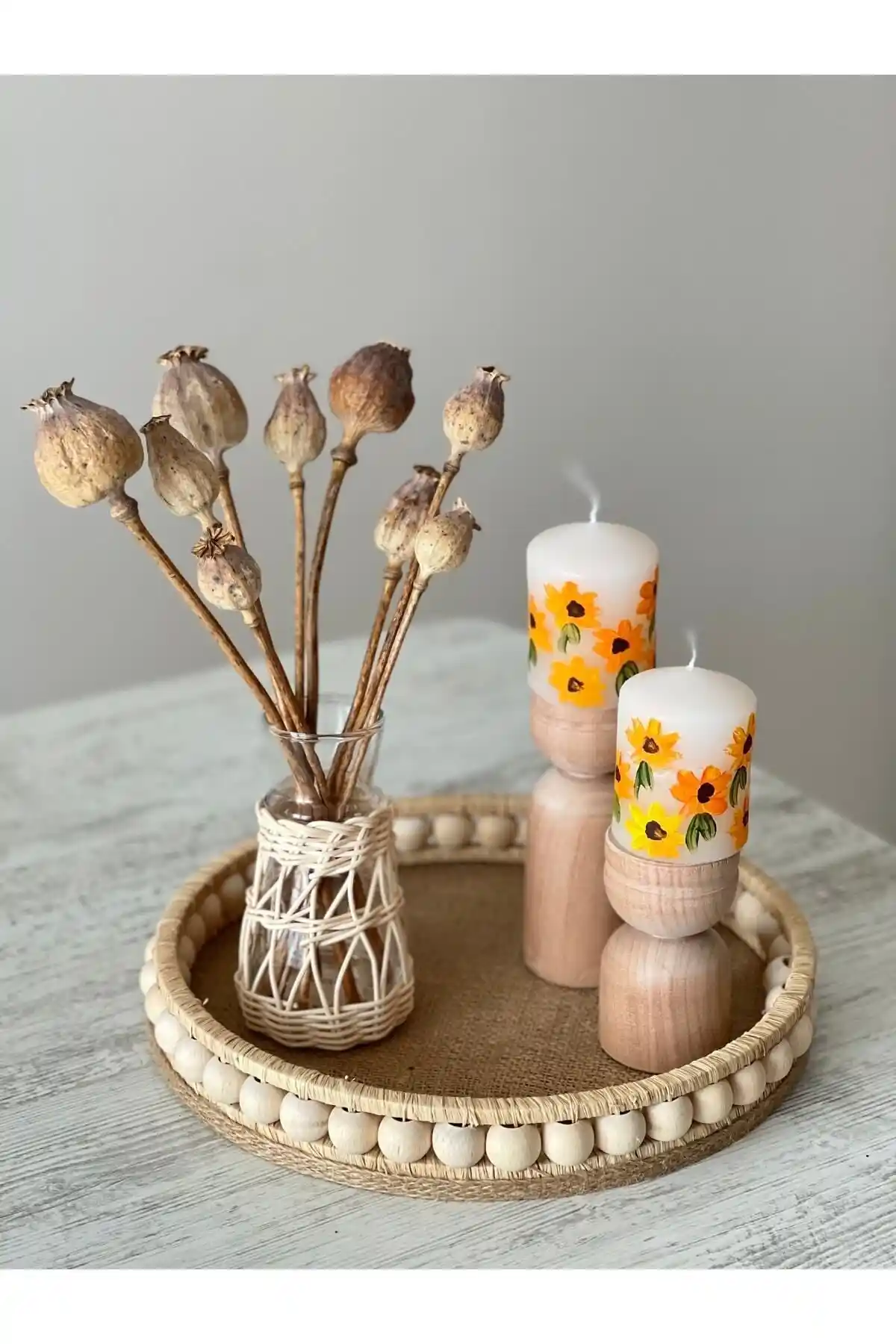 Doğal ahşap malzeme ve el yapımı işçiliğiyle öne çıkan bu bohem tarzı dekoratif tepsi, uzun ömürlü ve şık kullanım sağlar. Ev dekorasyonunuza otantik ve sıcak bir atmosfer katmak için ideal bir seçim.