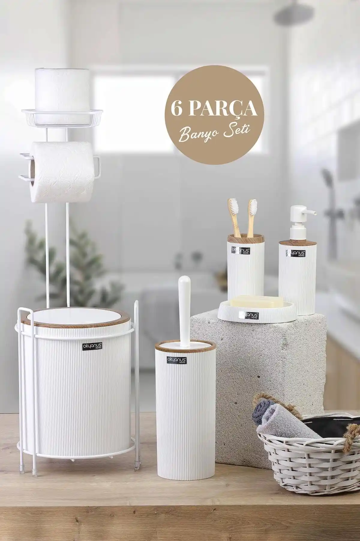 Okyanus Home'un 6 parçalık banyo seti, estetik ve fonksiyonelliği bir arada sunar. Hafif ve dayanıklı plastik materyaliyle kolay kullanım ve uzun ömür sağlar, modern banyo dekorasyonuna uyum sağlar.