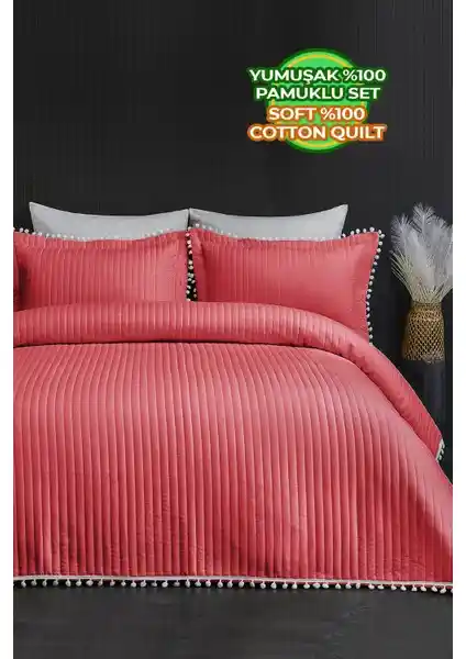 Kırmızı renk seçeneğiyle odanıza canlılık katan mikro pamuk kumaştan, şık ve dayanıklı kapitone ponpon yatak örtüsü, kolay bakım ve uzun ömür sağlar, yatak odanızı güzelleştirir.