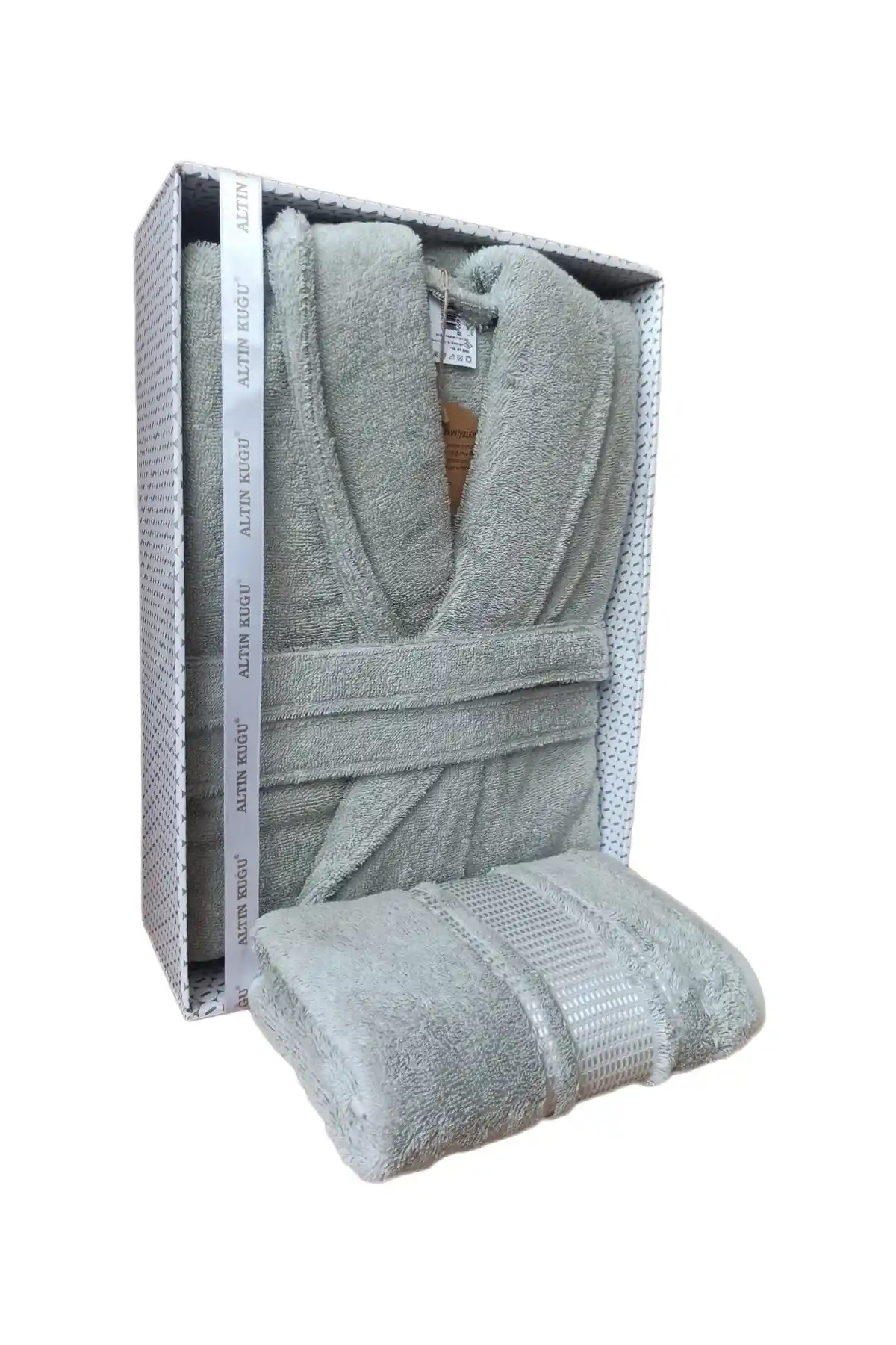 Yüksek kaliteli %100 pamuk malzemeden üretilen, canlı yeşil renkli, modern tasarımlı bornoz ve baş havlusu, yumuşak dokusu ve dayanıklılığıyla banyo sonrası rahatlık sağlar.