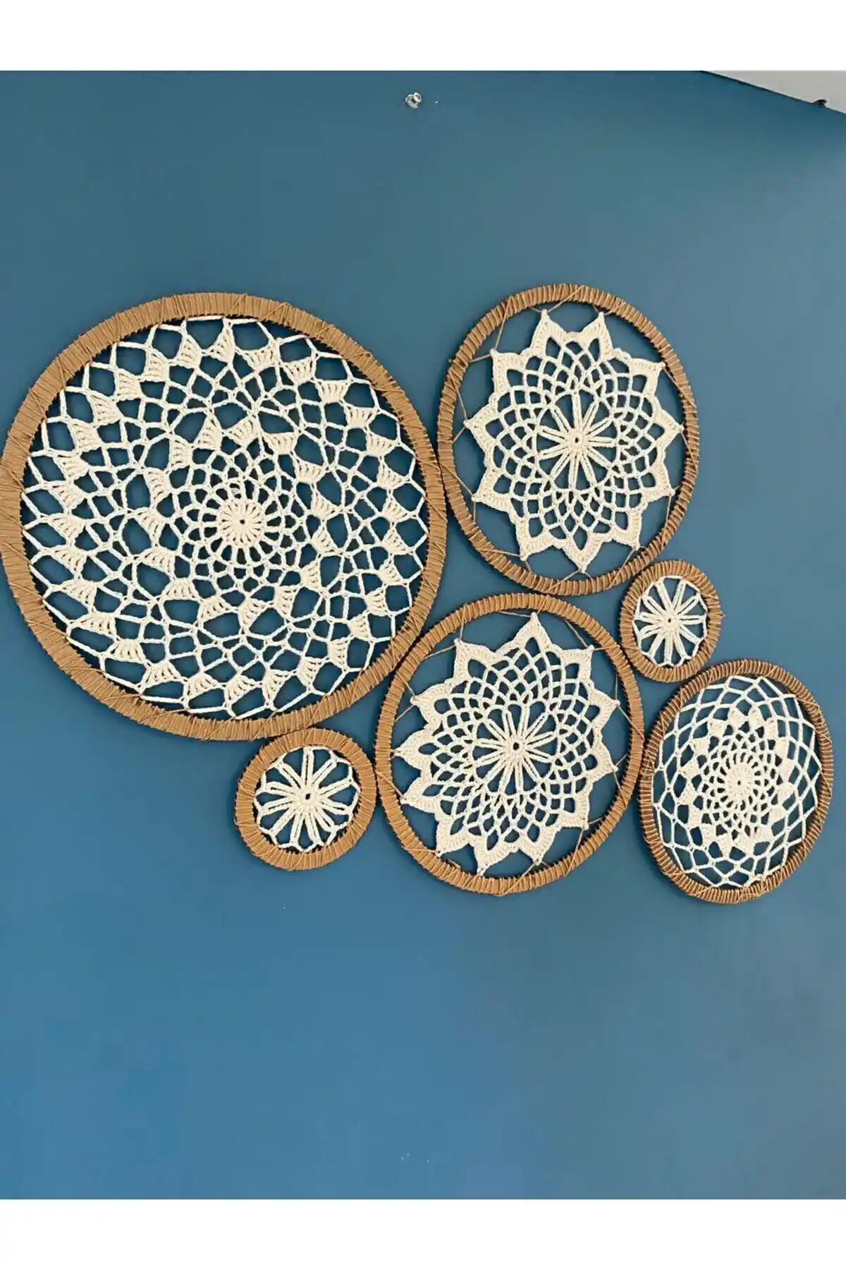 Bej renkli el örgüsü bohem düş kapanı duvar dekoru, ruhsal denge ve estetik sunar. Farklı ölçüler ve el işçiliğiyle, yaşam alanlarınızı huzurlu ve şık hale getirir.
