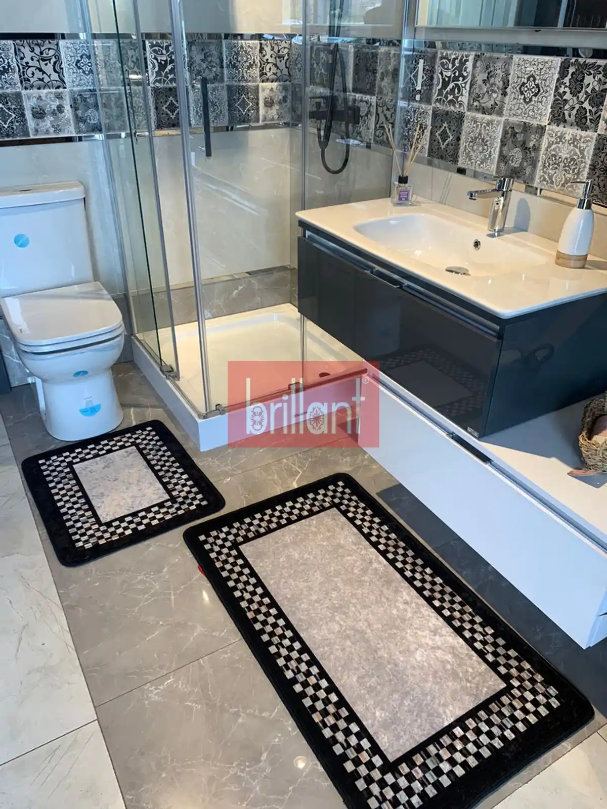 Dama desenli banyo halısı takımları, suya dayanıklı, kaymaz özellikleri ve şık tasarımıyla banyolarınıza estetik ve güvenli bir dokunuş sağlar. Farklı renk ve boyut seçenekleriyle dekorasyonunuza uyum sağlar.