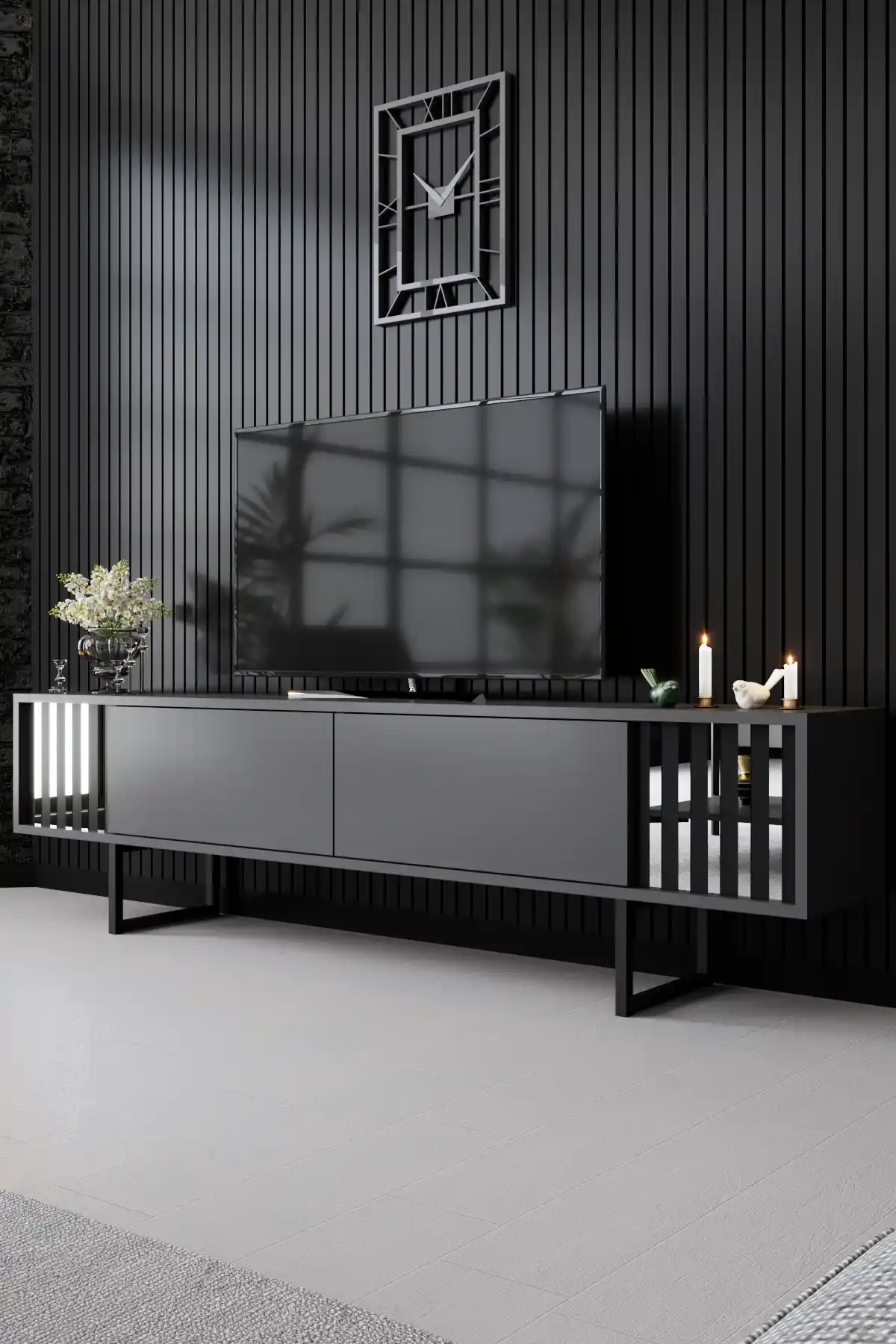Modatte Chrome Line demir ayaklı antrasit TV sehpası, şık tasarımı, dayanıklı malzemeleri ve kolay kurulumu ile modern evlere ideal çözüm sunar.