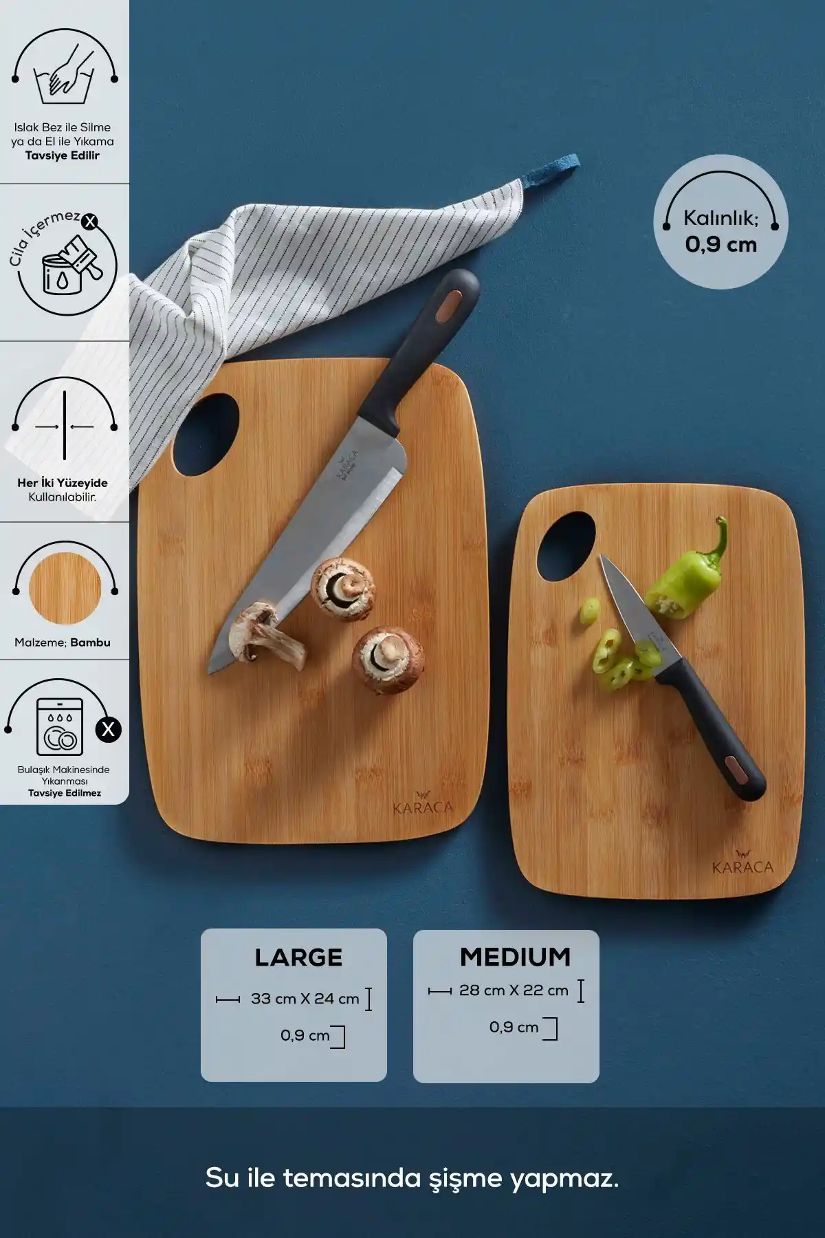 Karaca Karya'nın 2'li bambu kesme tahtası seti, doğal malzeme, dayanıklılık ve estetik sunar. Farklı boyutlarıyla mutfakta pratiklik sağlar, hijyenik ve çevre dostudur.