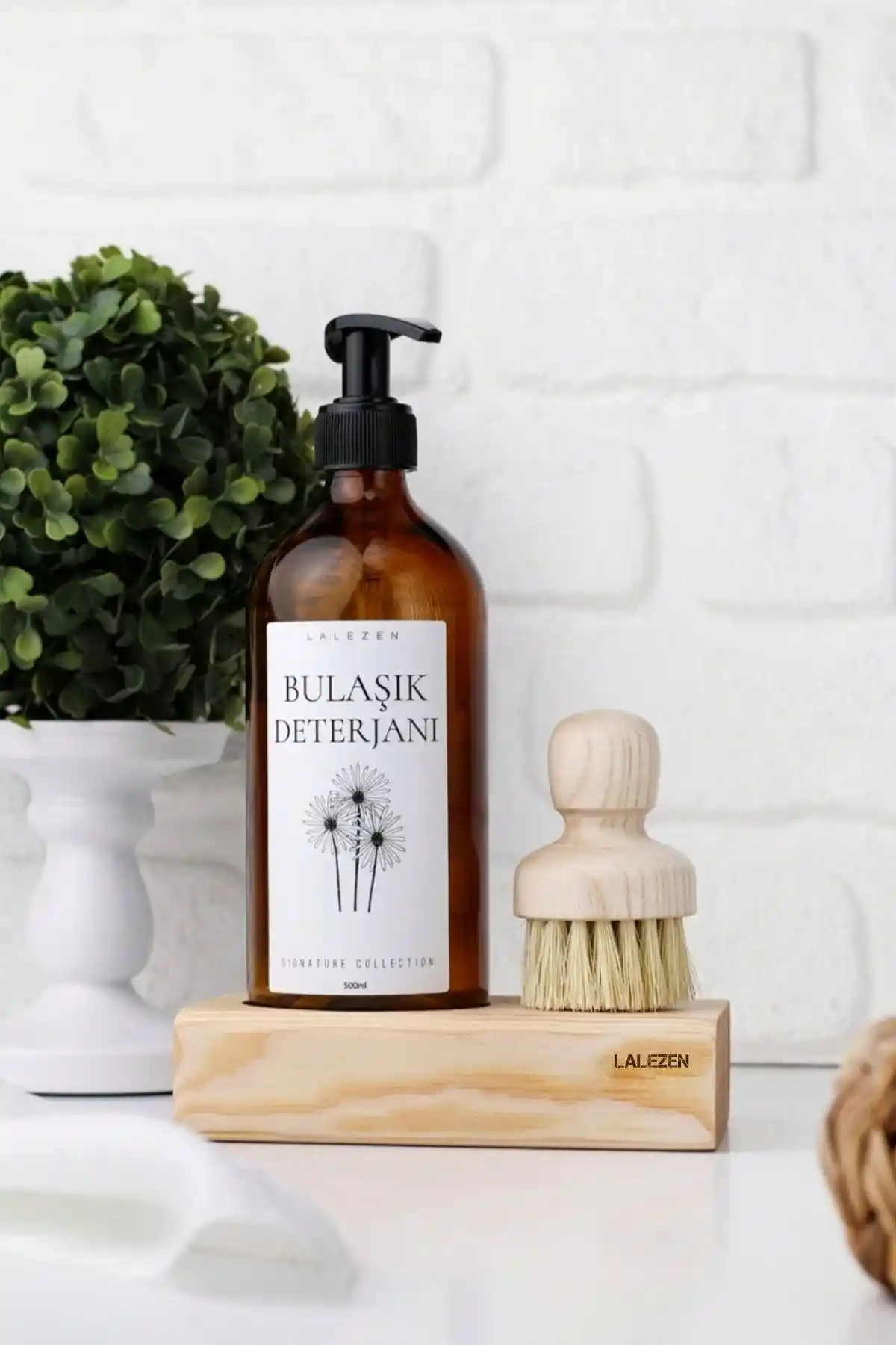 LALEZEN HOME'un tasarladığı ahşap standlı deterjan şişesi, doğal görünüm ve fonksiyonelliğiyle mutfağınıza şıklık katıyor. Cam gövde ve çiçek motifleriyle estetik bir kullanım sağlar.