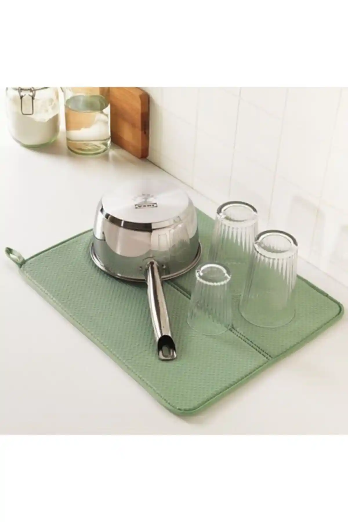 İkea'nın Nysköljd Yeşil bulaşık kurutma örtüsü, su emme ve hızlı kuruma özellikleriyle mutfakta hijyen sağlar, pratik saklama ve dayanıklılığıyla kullanıcı memnuniyetini artırır.