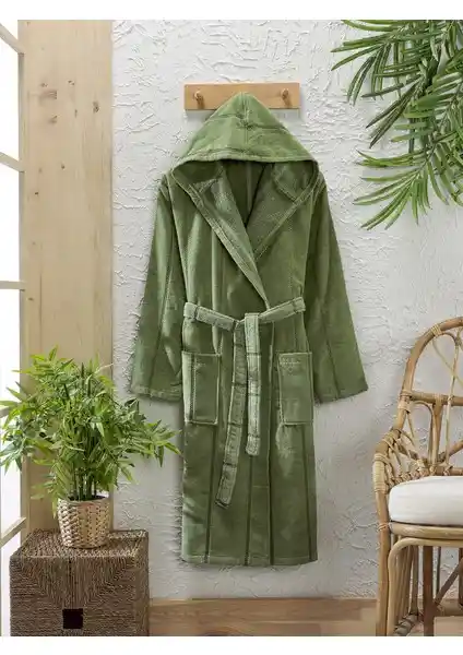 Semecca Lara yeşil kadife bornoz, yüksek kaliteli pamuk ve kadife dokusuyla üstün emicilik ve dayanıklılık sağlar. Kapüşonlu tasarımıyla sıcaklık ve pratiklik sunar, geniş beden seçenekleriyle rahat kullanım sağlar.
