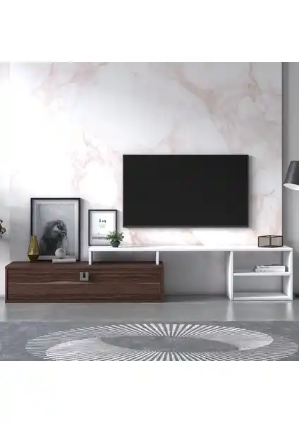 Optimo TV Ünitesi, şık Ceviz ve Beyaz renkleri, dayanıklı malzemeleri ve kolay montajıyla modern yaşam alanlarına estetik katıyor.