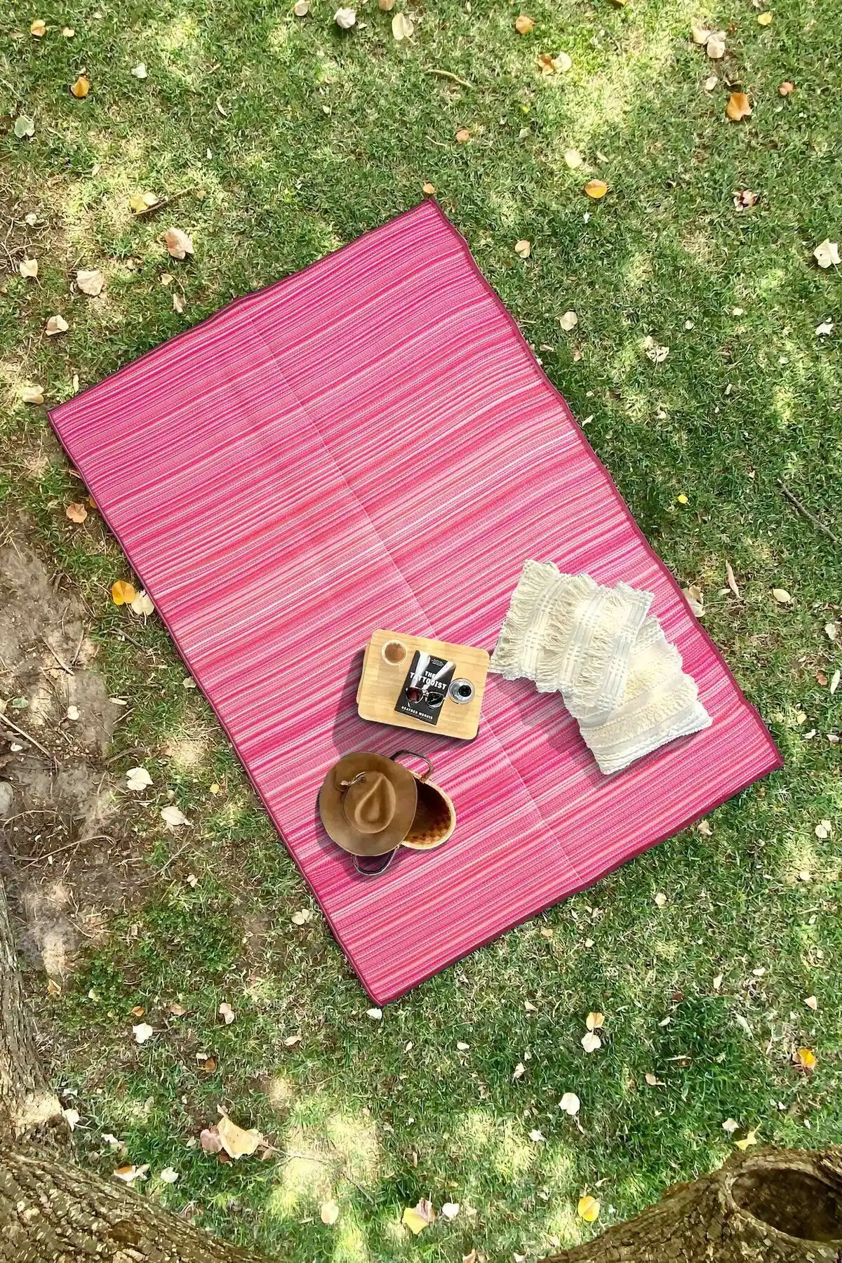 Caretta Home'un pembe katlanabilir halısı, hafif ve dayanıklı yapısıyla piknik, plaj ve bahçe gibi alanlarda kullanılabilir, kolay temizlenir ve çevre dostudur.