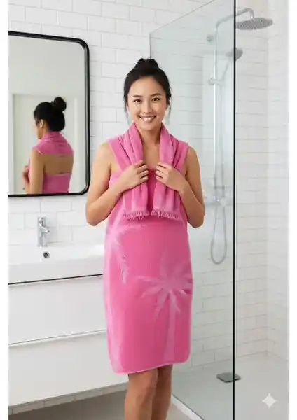 Şelale Sude banyo ve baş havlusu seti, pamuklu yapısı, geniş boyutları ve şık tasarımıyla günlük kullanımda yüksek performans sağlar, cilt dostudur ve modern banyo dekorasyonuna uyum sağlar.