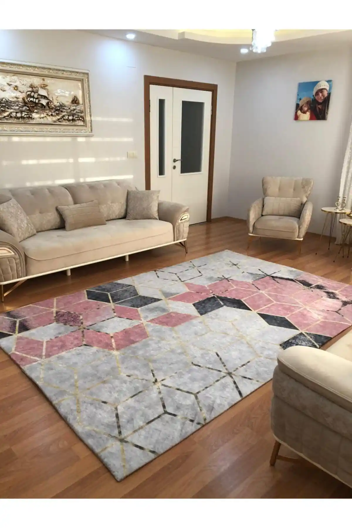 Kadife kumaş lastikli halı örtüsü, modern geometrik desenleri ve canlı pembe rengiyle ev dekorasyonunuza şıklık ve canlılık kazandırır, kolay bakım ve kullanım avantajları sunar.