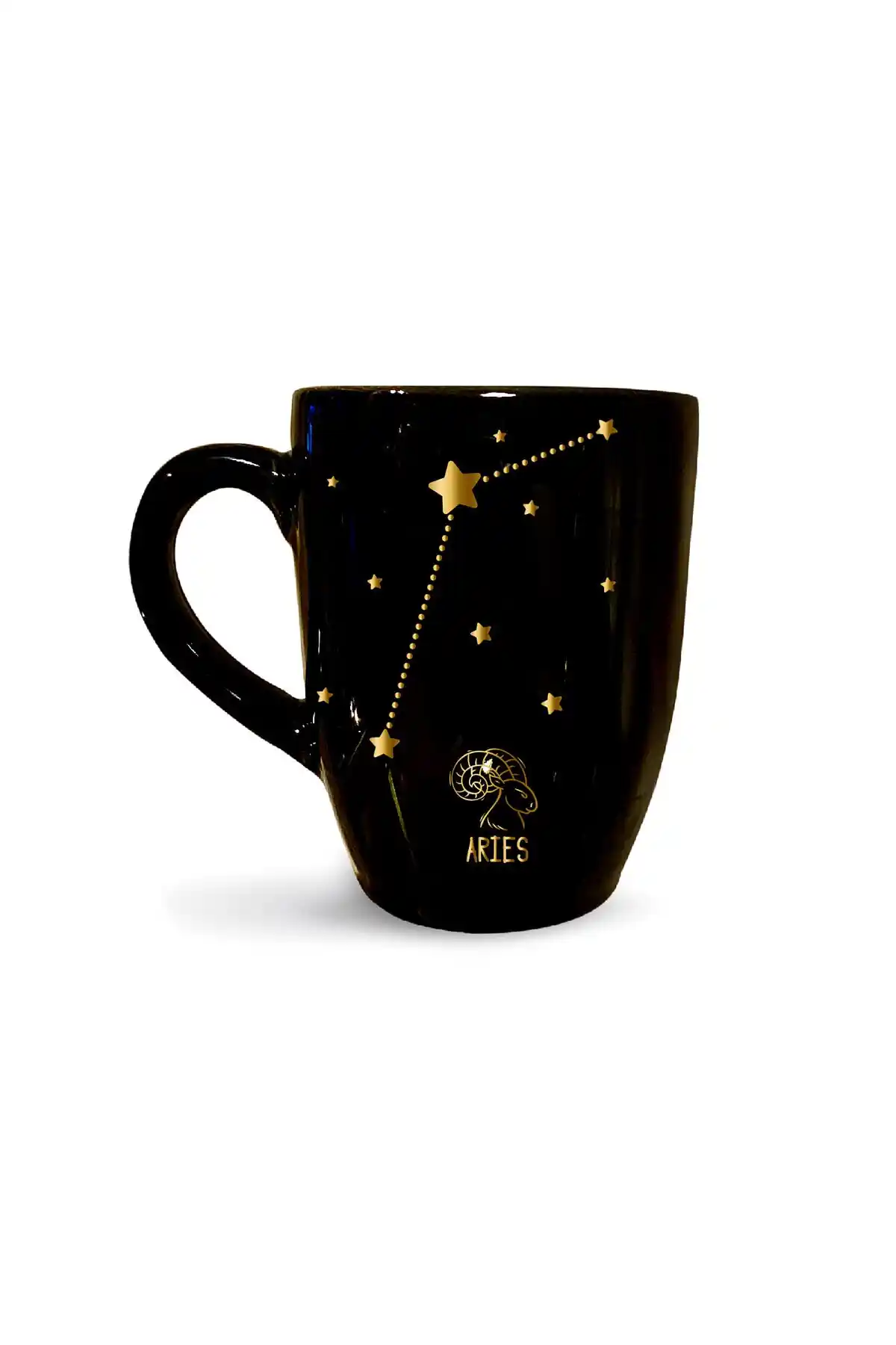 Siyah mat seramik kupa, 325 ml kapasiteyle günlük kahve/çay ritüellerine zarafet katar; Koç burcu yıldız haritası detayıyla kişisel stil ve dekoru güçlendirir; dayanıklı yapısı ve kolay temizliğiyle pratiklik sunar.