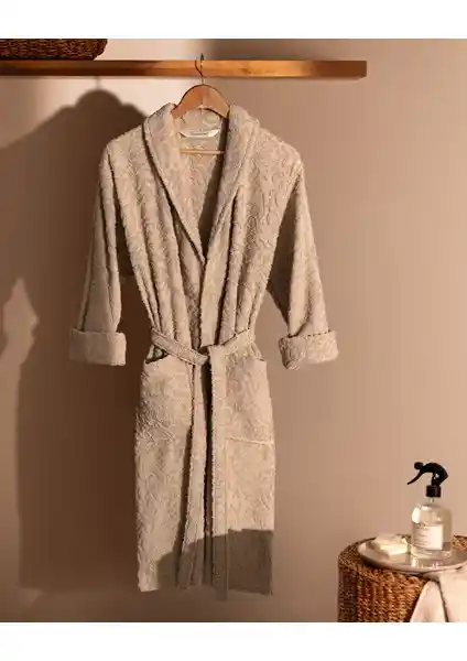 Bej renkli, %100 pamuk, yüksek emiciliğe sahip Madame Coco Roesia kadın bornozuyla evde konfor ve şıklık bir arada. Hafif, dayanıklı ve kolay bakım özellikleriyle ideal kullanım sağlar.
