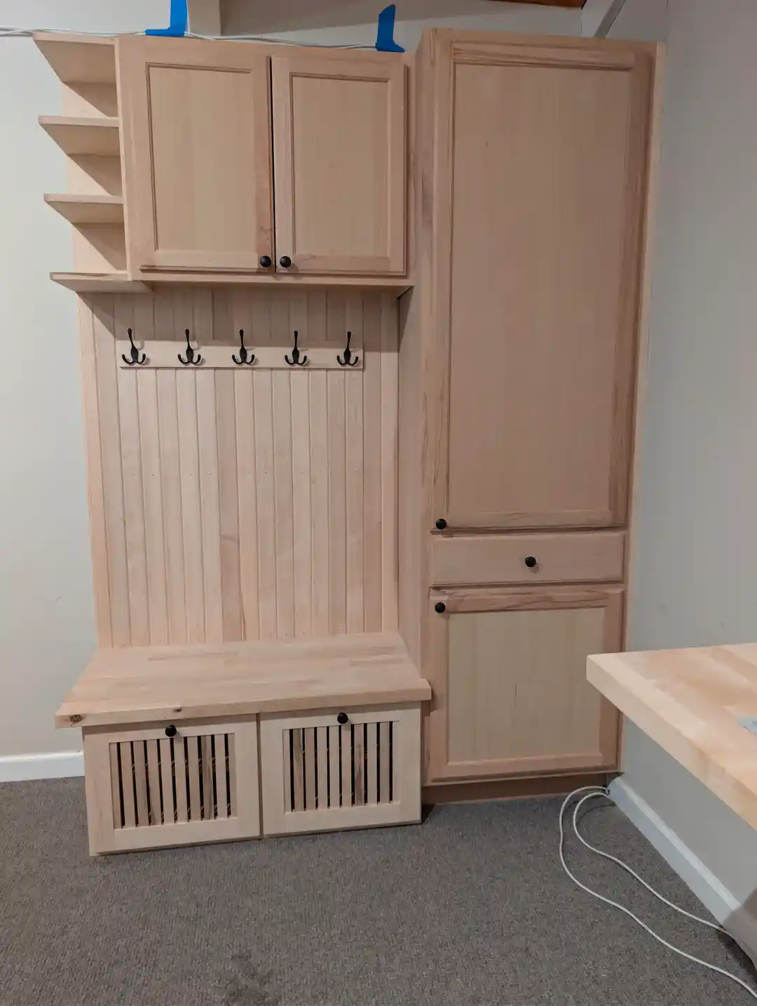 Mudroom dolabı ve asma tezgah projesinde huş, akçaağaç ve kayın ağaçları kullanılarak işlevsel ve estetik bir tasarım oluşturuldu. Montaj teknikleri ve malzeme seçimi detayları paylaşıldı.