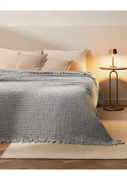 Madame Coco'nun Mulette koleksiyonundan gri çift kişilik yatak örtüsü, estetik ve fonksiyonelliği bir araya getirerek odalara zarif bir hava katıyor. Yüksek kaliteli pamuk-polyester karışımıyla dayanıklılık ve şıklık sağlıyor.
