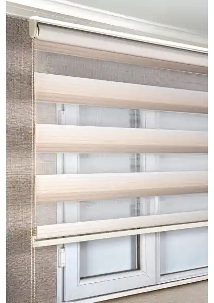 Krem renk degrade zebra stor perde, modern tasarımı ve yüksek kaliteli malzemeleriyle iç mekanlara şıklık katarken güneş ışığını kontrol eder ve kullanım kolaylığı sağlar.