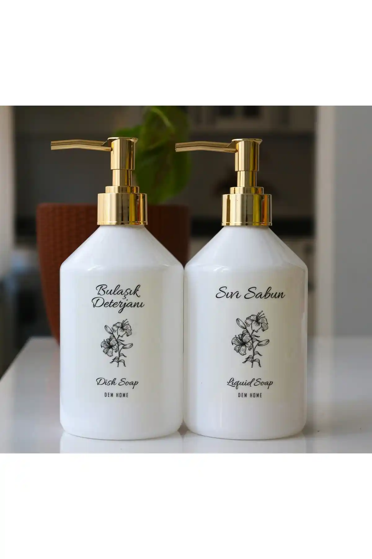 Dem Home'un 2'li seti, şık gold detaylar ve dayanıklı plastik malzeme ile modern banyo ve mutfak dekorasyonlarına uyum sağlar, çeşitli sıvı ürünleri düzenler.