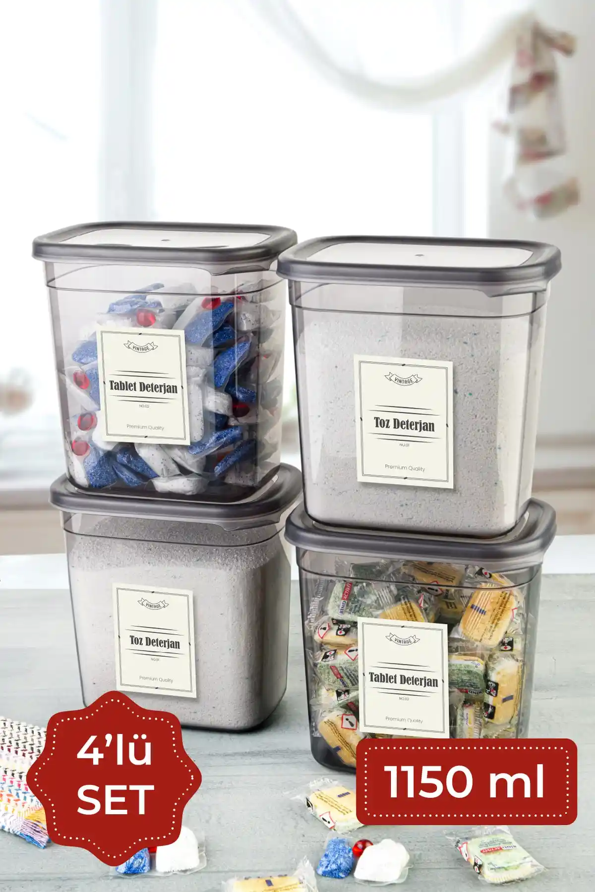 Gri renk ve geniş kapasiteye sahip Vienev deterjan saklama seti, dayanıklı plastik malzeme ve etiketli tasarımıyla mutfak düzeninizi kolaylaştırır, hijyen sağlar ve şıklık katıyor.
