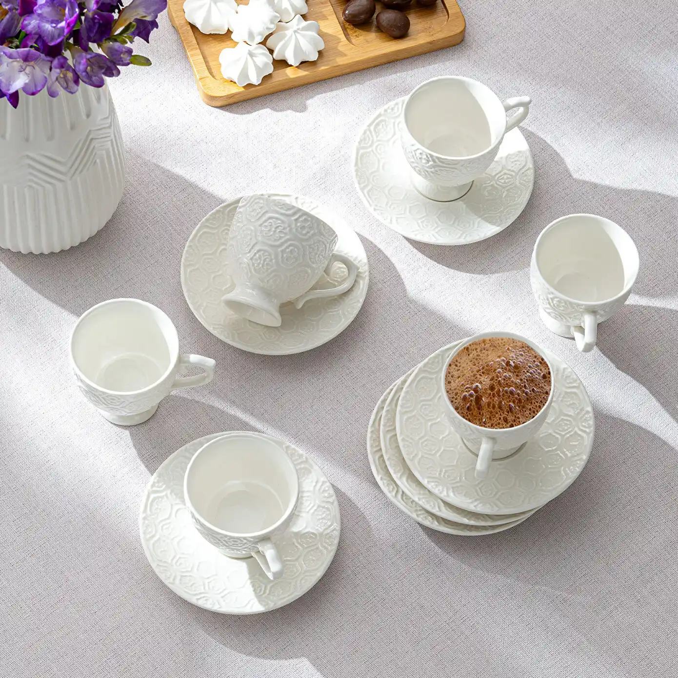 Ev ve ofis ortamları için dayanıklı ve estetik tasarımlı 6 kişilik kahve fincanları, uzun ömürlü malzemeleri ve şık görünümleriyle kahve deneyimini zenginleştirir.
