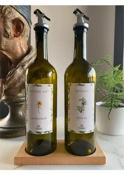 Tamu'nun 2'li cam yağdanlık seti, şık ahşap stand ve damlatmaz kapaklarıyla pratik ve estetik mutfak çözümleri sunar, 750 ml kapasite ile günlük kullanım için idealdir.