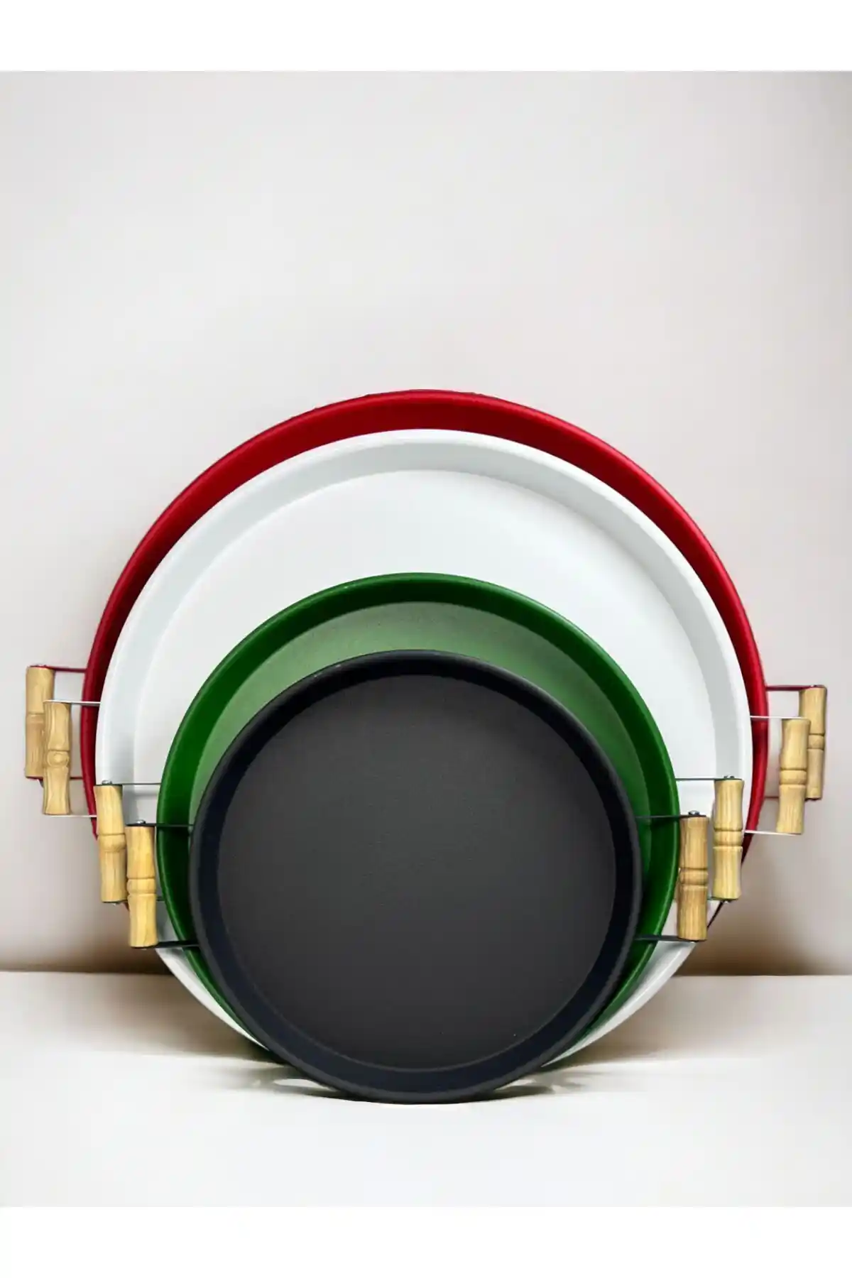 Modern mutfaklar için ideal, dayanıklı metal malzemeden üretilmiş, renkli ve kullanışlı yuvarlak tepsi seti. Farklı boyutlarıyla çeşitli sunumlara uygun, şık ve pratik mutfak aksesuarı.