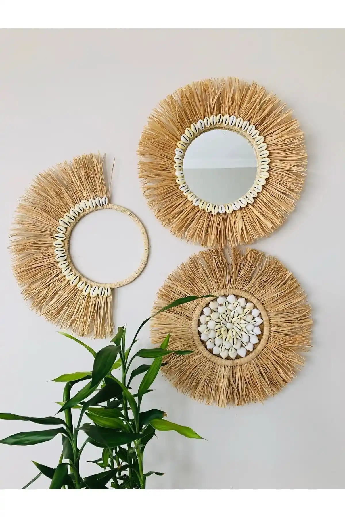 El yapımı ve doğal jüt malzeme ile tasarlanmış, deniz kabuklarıyla süslenmiş aynalar seti, sıcak renkleriyle evinizde özgün ve samimi bir atmosfer oluşturur.
