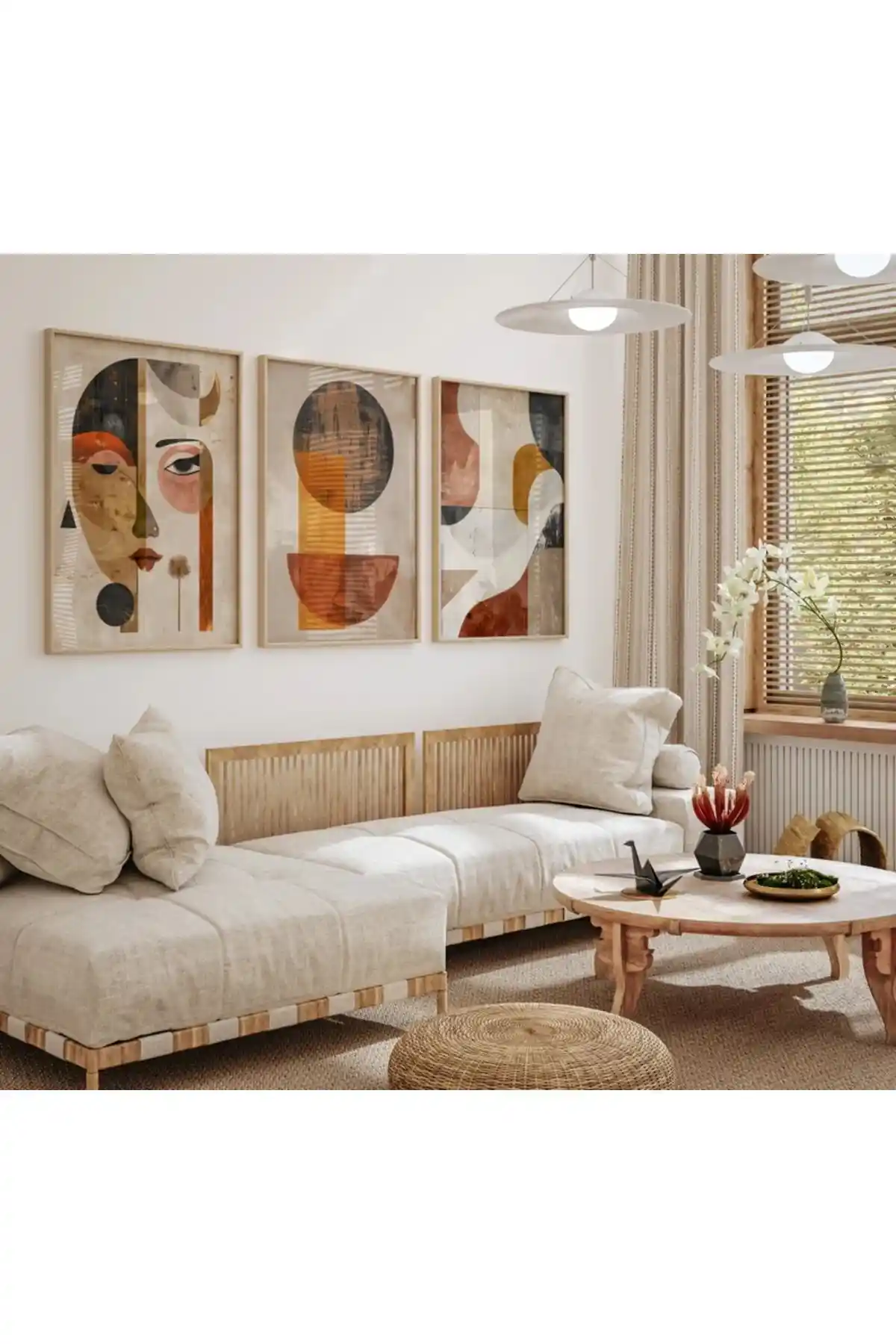 Modern tarzı ve dayanıklı malzemeleriyle öne çıkan bu 3’lü soyut tablo seti, iç mekanlarınızı şık ve sıcak hale getirir, kolay montaj ve çok yönlü kullanımıyla dekorasyonunuza değer katar.