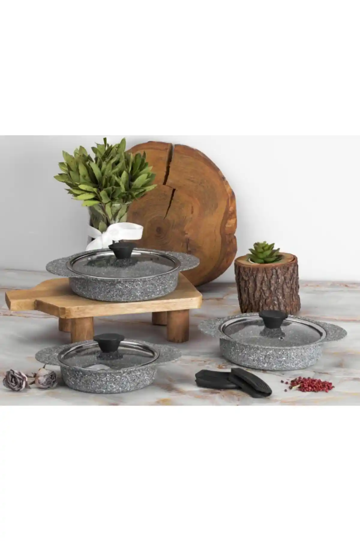 Taç Granit Plus 6 Parça Gri Silikon Kulplu Sahan Seti, yüksek kaliteli granit malzeme ve silikon kulplar sayesinde dayanıklı ve güvenli yemek pişirme imkanı sunar, şık tasarımıyla mutfağınıza estetik katıyor.