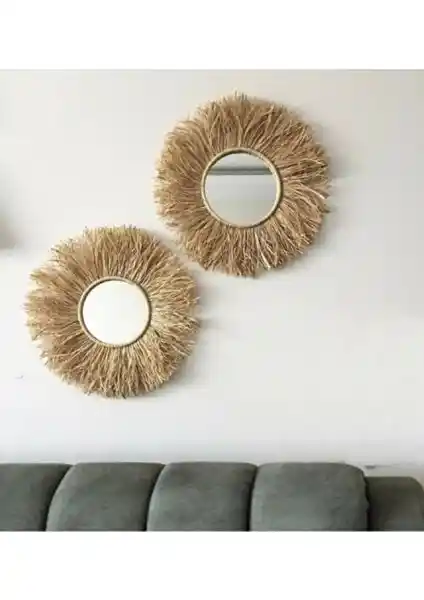 Doğal muz lifinden yapılmış, el işçiliği ve ahşap çerçevesiyle öne çıkan bu bohem tarzı aynalar, dayanıklı ve çevre dostu olup yaşam alanlarınıza özgünlük ve sıcaklık katar.