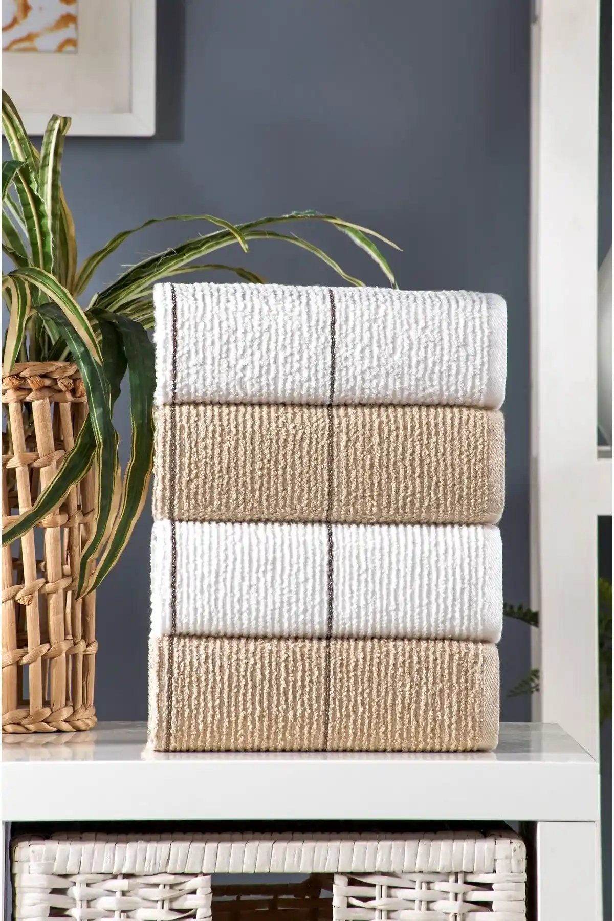 Eumenia Hand Sahara seti, %100 pamuklu, bej-krem renkli, yüksek su emiciliği ve dayanıklılığıyla günlük kullanıma uygun şık havlu koleksiyonudur.
